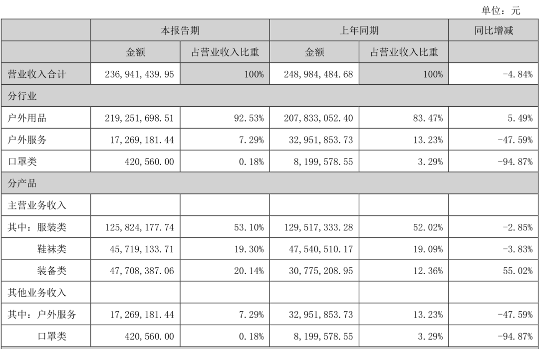 半年报显示,装备类所占营业收入的比重,从去年的占比12.36%提升至20.14%,增幅颇大,但服装、鞋袜这二者才是主力(总计占比72.4%)。