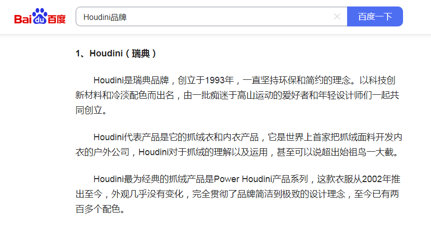 据公开资料获悉,Houdini以科技创新材料和冷淡配色而出名,由一批痴迷于高山运动的爱好者和年轻设计师们一起共同创立,Houdini代表产品是它的抓绒衣和内衣产品,它是世界上首家把抓绒面料开发内衣的户外公司,有观点认为:“Houdini对于抓绒的理解以及运用,甚至可以说超出始祖鸟一大截。”