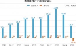 2020年,奇信股份迎来上市后的首次亏损。财报显示,2020年,奇信股份的营业总收入为21.1亿元,同比下滑47.45%;归属于上市公司股东的净利润为-5.55亿元,而上年盈利0.86亿元。