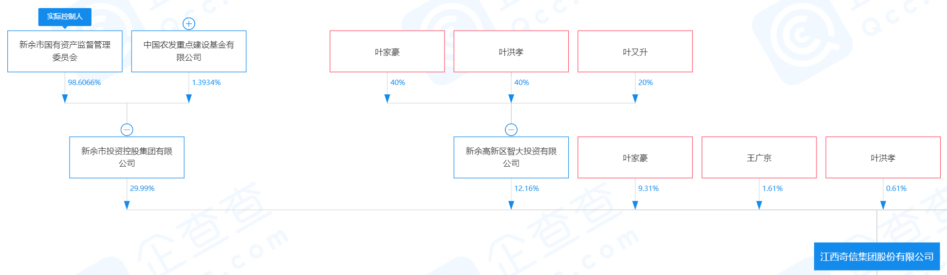 早在2020年7月,奇信股份控股股东由智大控股变更为新余投控。智大控股及其关联人叶秀冬与新余投控签署了《股份转让协议》,按照16.21 元/股的转让价格,合计转让其持有的公司股份6747.75万股,占公司总股本的29.99%。此外,智大控股还无条件的永久放弃其未转让的剩余公司14.11%股份对应的表决权。资料显示,当时智大控股的股东为叶家豪、叶洪孝、叶又升,持股比例分别为40%、40%、20%。