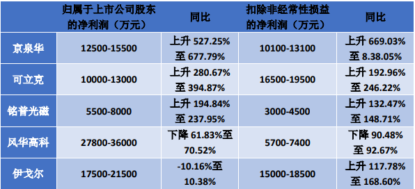 包括可立克在内,截至目前,共有五家电感与电子变压器企业公布了业绩预告,记者梳理如下: