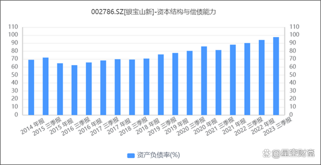 截至2023年三季度末,公司账面货币资金不足1亿元,而同期短期借款就有4.8亿元,困窘之态明显。长期来看,上市以来,公司的资产负债率一路飙升,由60%+一路飙到90%+。截至2023年三季度末,银宝山新的资产负债率已高达97.54%,逼近100%。