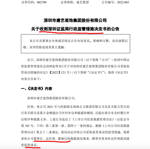 建艺集团(002789)(002789.SZ)发布关于收到深圳证监局行政监管措施决定书的公告称,近日,公司收到中国证券监督管理委员会深圳监管局《关于对深圳市建艺装饰集团股份有限公司采取监管谈话措施的决定》,具体内容如下: