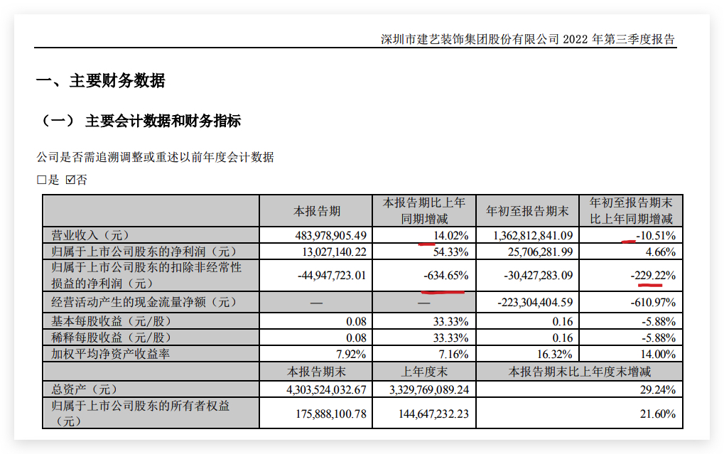 中华网财经11月1日讯:建艺集团(002789)(002789.SZ)发布2022年三季度报告显示,2022年第三季度,建艺集团营业收入4.84亿元,同比增长14.02%;归属于上市公司股东的净利润1302.71万元,同比增5长4.33%;归属于上市公司股东的扣非净亏损4494.77万元,同比下滑634.65%。基本每股收益0.08元。