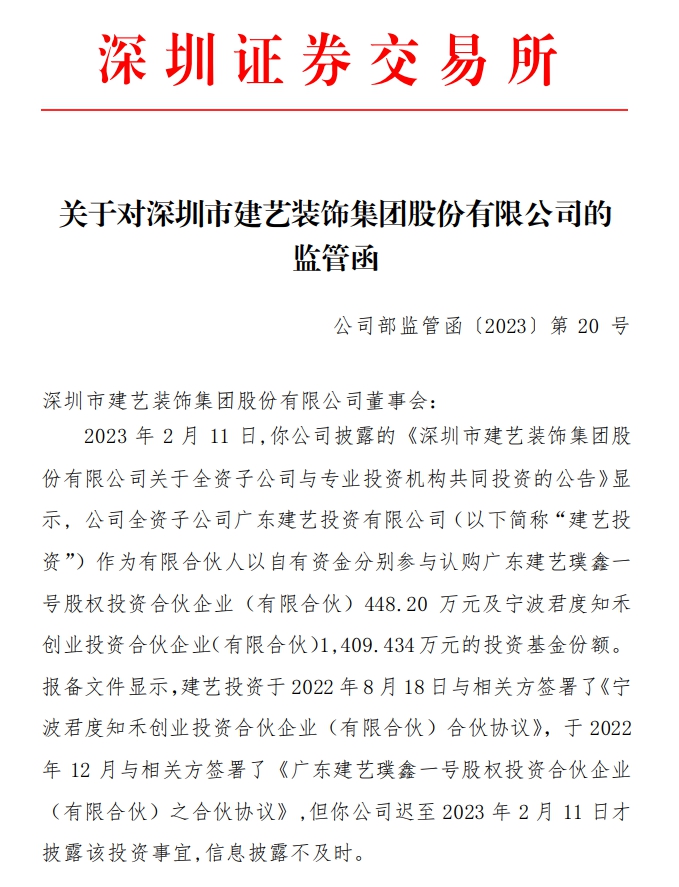 监管函显示,2023年2月11日,建艺集团披露的《深圳市建艺装饰集团股份有限公司关于全资子公司与专业投资机构共同投资的公告》显示,公司全资子公司广东建艺投资有限公司(简称“建艺投资”)作为有限合伙人以自有资金分别参与认购广东建艺璞鑫一号股权投资合伙企业(有限合伙)448.20万元及宁波君度知禾创业投资合伙企业(有限合伙)1409.434万元的投资基金份额。