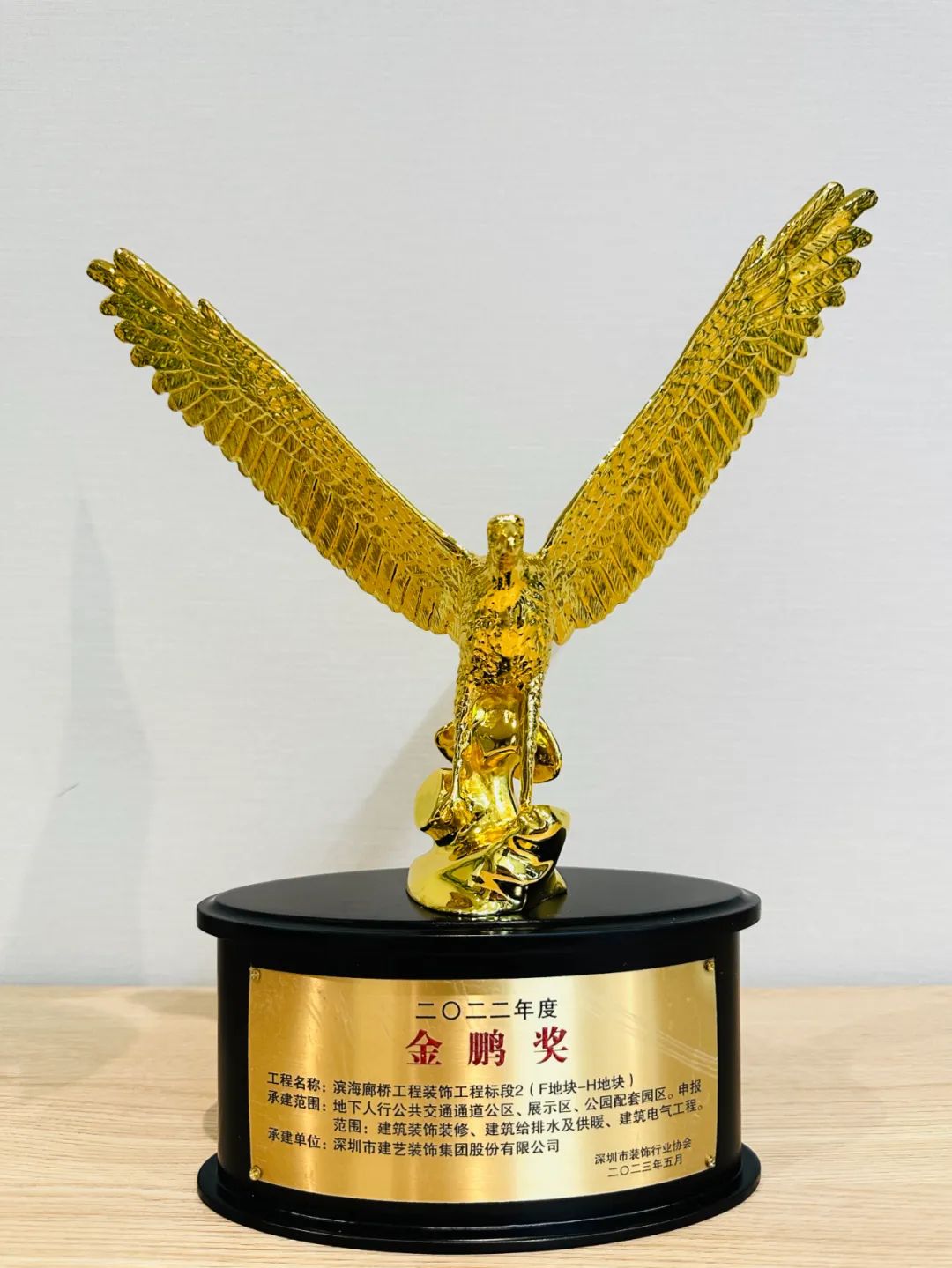 近日,由深圳市装饰行业协会主办的深圳市装饰工程金鹏奖评审结果通知,建艺集团承建的滨海廊桥装饰工程标段2(F地块-H地块)工程荣获“2022 年度深圳市金鹏奖”。