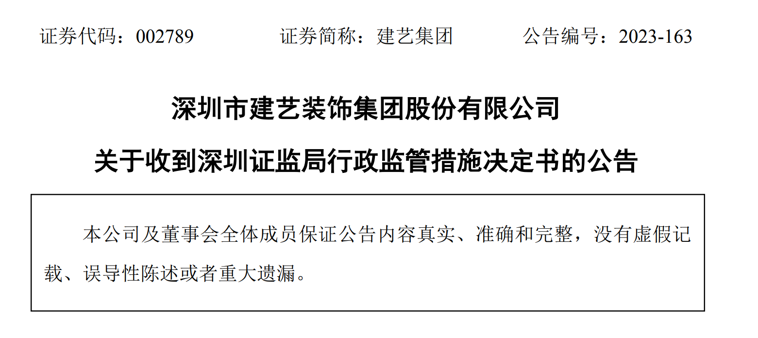 公告显示,近日,建艺集团收到中国证券监督管理委员会深圳监管局《关于对深圳市建艺装饰集团股份有限公司采取责令改正措施的决定》(【2023】279号)(以下简称“《决定书》”)及《关于对刘海云等人采取出具警示函措施的决定》(【2023】280号)(以下简称“《警示函》”)。