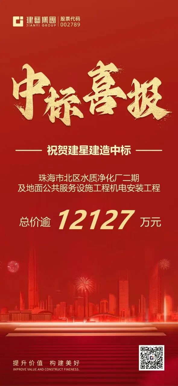 近日,深圳市建艺装饰集团股份有限公司旗下子公司广东建星建造集团有限公司(以下称“建星集团”)喜获中标:珠海市北区水质净化厂二期及地面公共服务设施工程机电安装工程,总价逾1.21亿元。