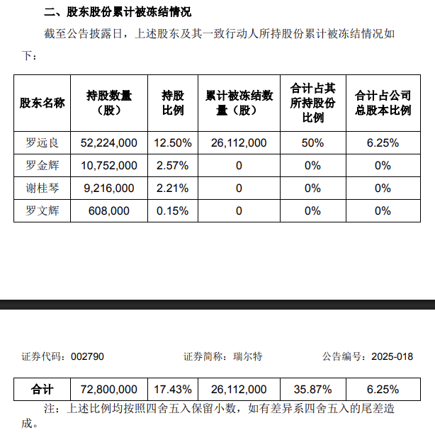 根据公告内容,罗远良目前持有瑞尔特5222.40万股股票,占总股本的约12.5%。然而,由于离婚诉讼的影响,其中的2611.2万股已被法院冻结,占其持股总数的50%,同时也相当于公司总股本的6.25%。以4月24日的开盘价7.16元/股计算,被冻结股份的市值高达约1.87亿元。