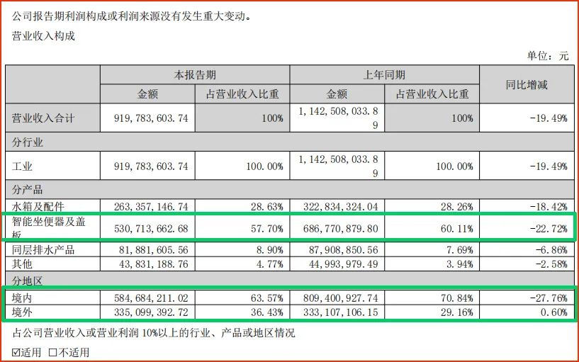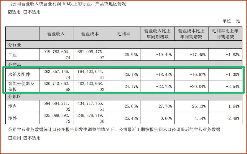 按产品毛利率来看,两大主打品类产品毛利率也出现了下滑。其中,水箱及配件的毛利率为26.18%,下滑1.30%;智能座便器及盖板毛利率为24.17%,下滑2.54%。
