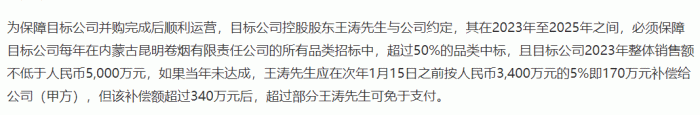 至于未来的业绩,则是由王涛承诺的:在2023至2025年之间,保障湖北和嘉每年在内蒙古昆明卷烟有限责任公司的所有品类招标中,超过50%的品类中标,且目标公司2023年整体销售额不低于人民币5000万元。