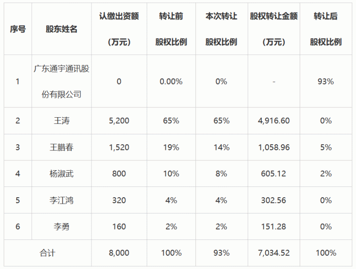 据通宇通讯披露的信息显示,此次的交易对方有王涛、王腊春、杨淑武、李江鸿、李勇等5位自然人,上述5人分别持有标的公司湖北和嘉65%、19%、10%、4%、2%的股份。交易完成后,仅王腊春、杨淑武保留湖北和嘉5%、2%的股份。