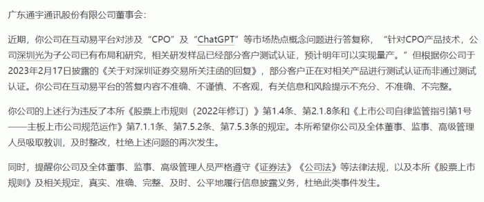然而在ChatGPT等概念突然大火之后,通宇通讯却仍然借助深圳光为的研发和产品,在互动平台大谈ChatGPT、CPO概念,此举也导致其股价大幅拉升。