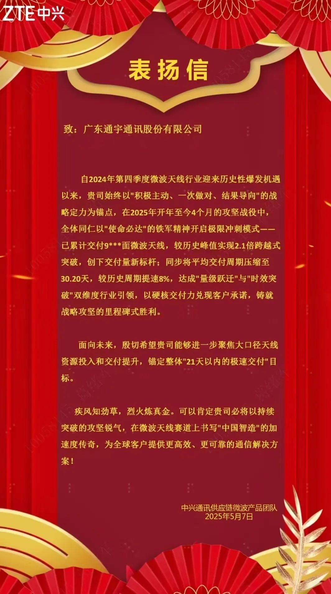 通宇通讯是中兴通讯长期、忠实的合作伙伴,展望未来,我们将把此次表扬化作前行的动力,以更高标准强化技术创新,全方位提升交付能力,全力构建更具核心竞争力的产品与服务体系。以坚韧不拔的攻坚精神,在微波天线领域持续深耕,为客户带来更多高质量、高效率的产品,为全球通信产业发展贡献通宇力量。