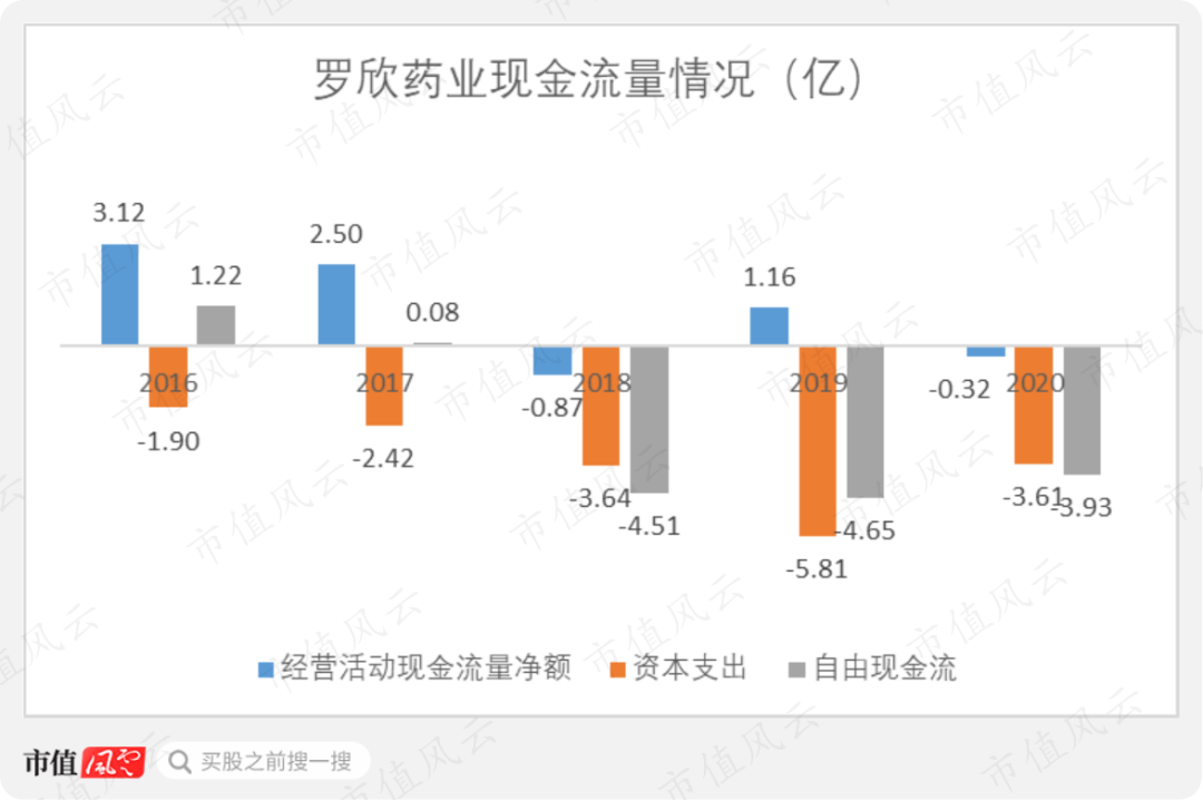 2020年,罗欣药业自由现金流为-3.93亿,而且,当年的经营活动现金流量净额为-0.32亿。