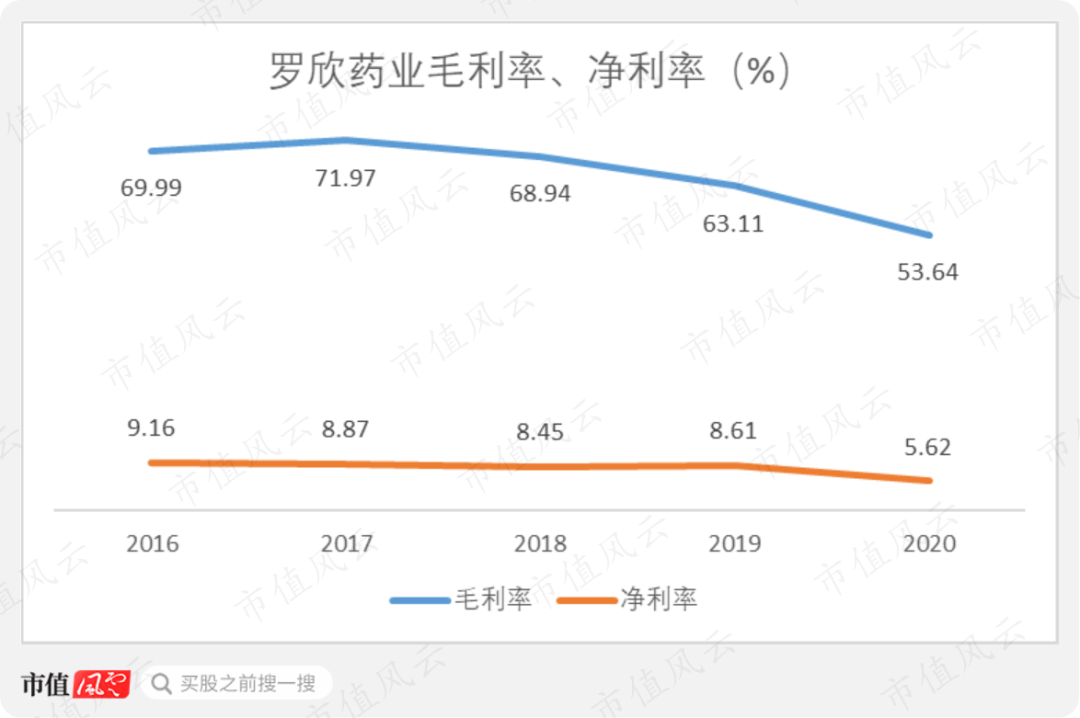 2020年,罗欣药业的毛利率为53.64%,比2017年的71.97%,已经下降了18个百分点。