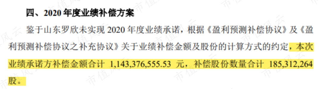 按照约定,承诺方需要做出相应的业绩补偿。罗欣控股等33名承诺方需补偿11.43亿,共1.85亿股,上市公司将以1元的价格回购该部分股票并注销。