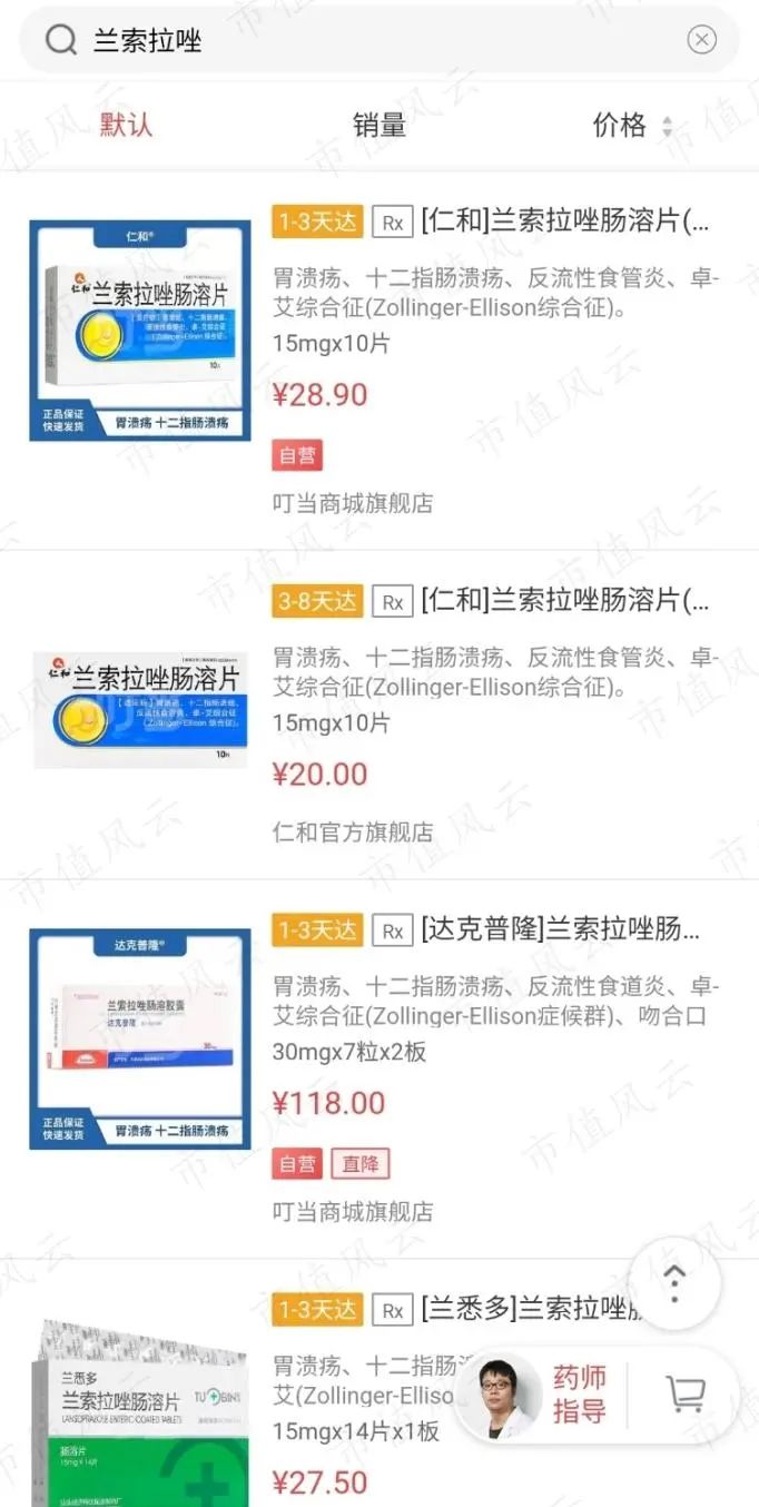 风云君随手打开叮当快药小程序,发现与注射用兰索拉唑功效类似的兰索拉唑肠溶片,前几名几乎都是仁和牌,生产厂家是华纳药厂(688799.SH)。