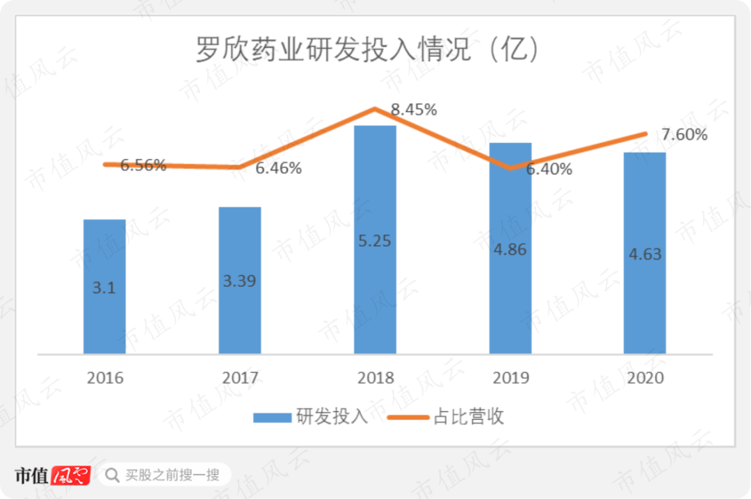 2018年是罗欣药业研发投入最高的一年,当年,公司研发投入5.25亿,占比营收8.45%。