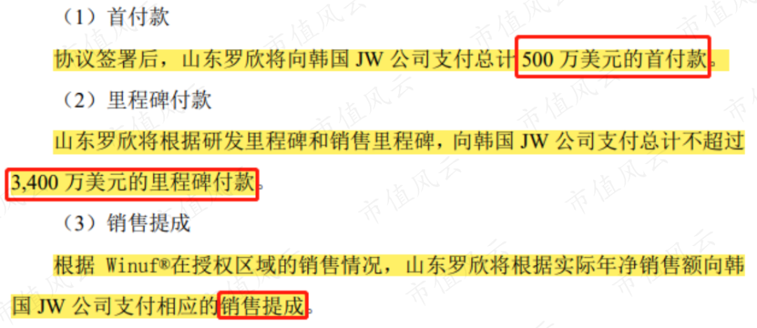 协议签署后,公司就向韩国JW公司支付500万美元(折合人民币约3,200万元)首付款,不超过3,400万美元(折合人民币约2.2亿)的里程碑付款,以及每年根据销售净额向其支付销售提成。