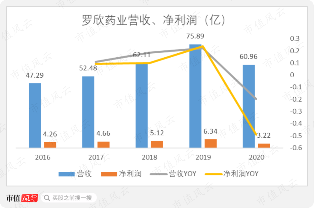 2019年,罗欣药业实现扣非净利润5.65亿,完成了当年的业绩承诺。但是2020年营收为60.96亿,同比下降近20%。