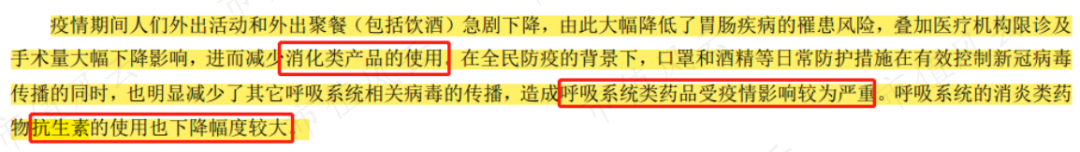 公司认为是新冠疫情的爆发,消化类产品、呼吸系统类产品、抗生素等产品销量下降。
