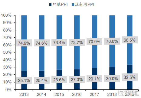 同时,从国信证券的研究数据看出,2013年至2019年间,口服PPI的市场份额在不断提升,由此可以看出未来口服PPI的市场正在稳步增长中。
