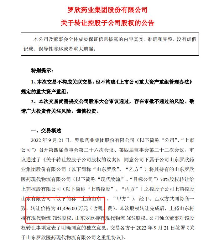 资料显示,2021年和2022年上半年,现代物流实现营收25.95亿元、12.97亿元,净利润为0.96亿元、0.50亿元。经过粗略计算,2021年和2022年上半年,现代物流营收占罗欣药业总营收的比例为40.06%、41.27%,现代物流控股权被转让后,也将导致罗欣药业营业收入的大幅下降。
