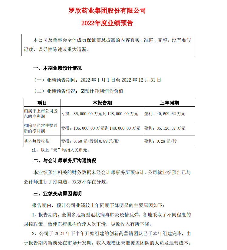 近日,罗欣药业集团股份有限公司(下称“罗欣药业”或“公司”)公布了2022年业绩预告,公司预计2022年净利润为-8.6亿元至-12.8亿元,扣非净利润为-10.6亿元至-14.8亿元,这是借壳上市三年对赌期过后罗欣药业的首份年度成绩单。