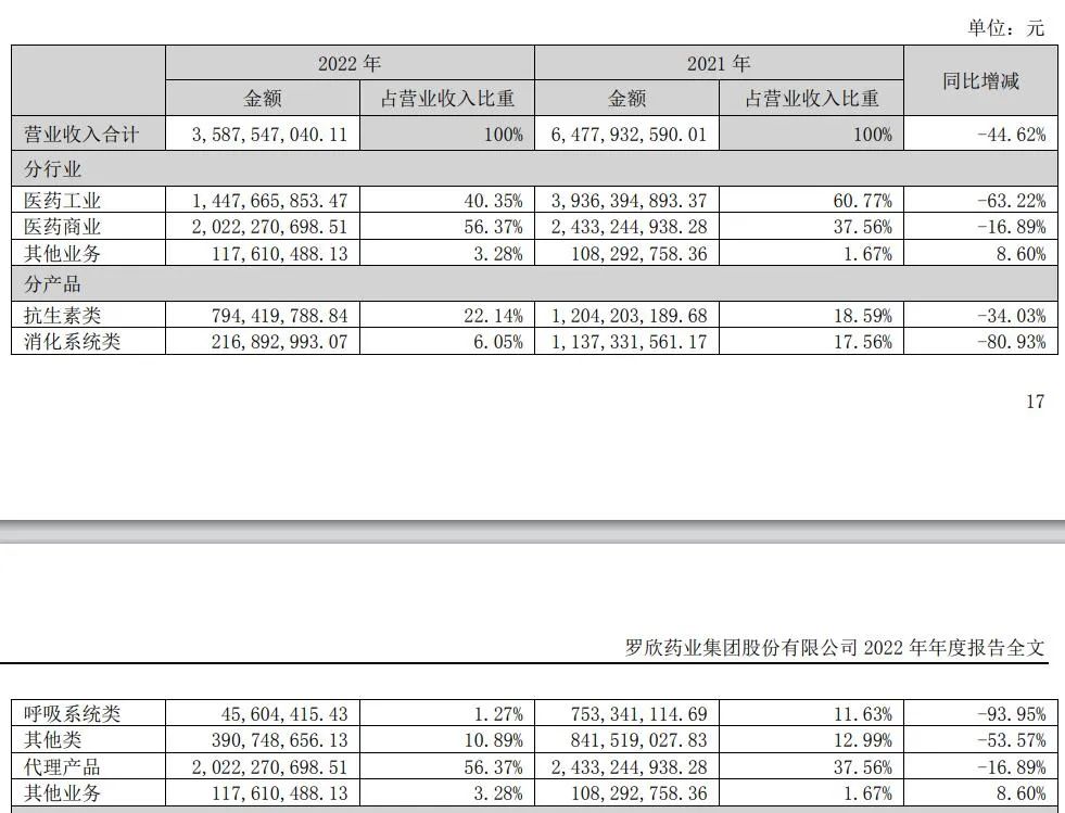 细分产品,抗生素类营收7.94亿,同比下降34.03%;消化系统类营收2.17亿,同比下降80.93%;呼吸系统类营收0.456亿,下降93.95%;其他类营收3.91亿元,下滑53.57%;代理产品20.22亿元,下降16.98%。