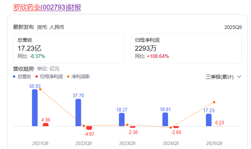 2025年前三季度财报数据显示,罗欣药业营业总收入为17.23亿元,与去年同期相比总营收减少1.58亿元,下降8.37%。