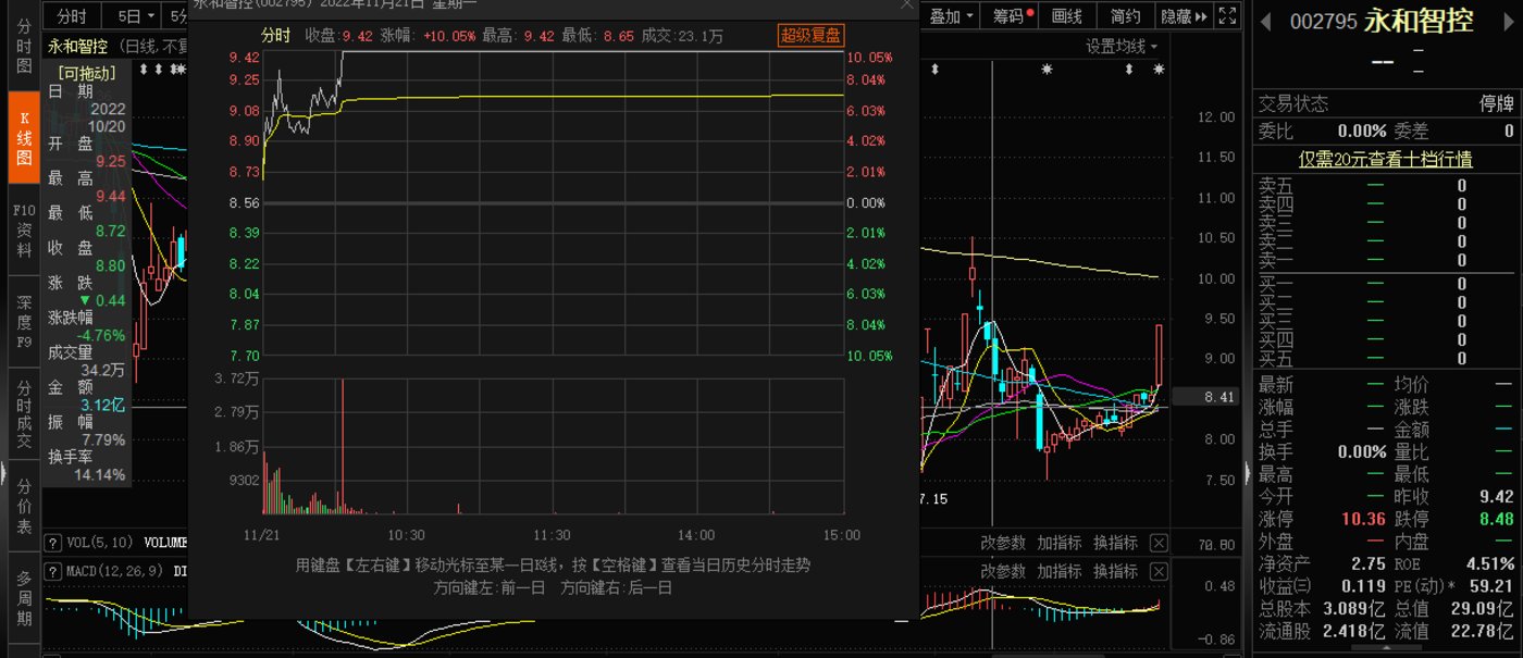据东方财富显示,11月21日早盘开盘,永和智控开盘高开1.52%,交易半个小时后,在买盘的推动下,永和智控封上涨停板。当日成交额达2.11亿元,较前几日成交额明显放大。