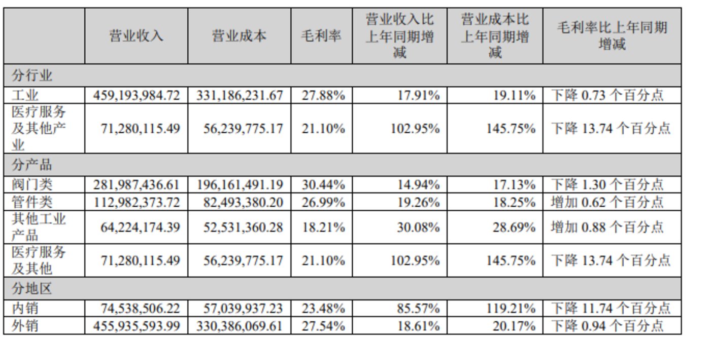 尽管曹德莅不断加码在医疗产业上的布局,但永和智控目前业务依旧依赖原有主业。今年上半年,公司阀门、管件及其他工业产品的营收为4.59亿元;医疗服务板块业务营收仅为7128万元,该业务当期的毛利率为21.1%,同比下降13.74个百分点。