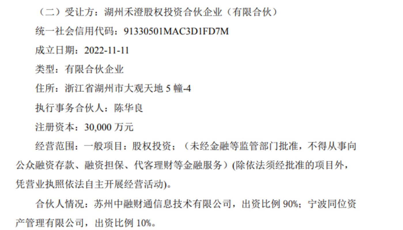 钛媒体APP注意到,接盘方湖州禾澄似乎是为了此次收购而专门成立的。据公告显示,湖州禾澄成立于2022年11月11日,注册资本为3亿元,经营范围为股权投资。