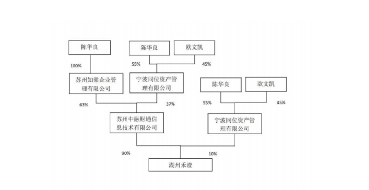 股权关系显示,苏州中融财通信息技术有限公司、宁波同位资产管理有限公司分别持有湖州禾澄90%、10%的出资比例。进一步穿透,陈华良100%持股的苏州知棠企业管理有限公司、宁波同位资产管理有限公司持有苏州中融财通信息技术有限公司63%、37%的股权,宁波同位资产管理有限公司的股东系陈华良、欧文凯,最终陈华良为湖州禾澄的执行事务合伙人。