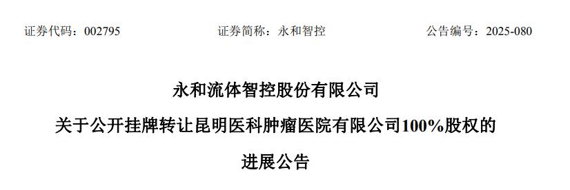 2025年11月24日,永和智控在西南联合产权交易所首次公开挂牌转让昆明医科 100%股权,挂牌价格为 3,592.77 万元。12 月 9 日,公司推进第二次挂牌转让。挂牌转让底价为 2,874.216 万元。