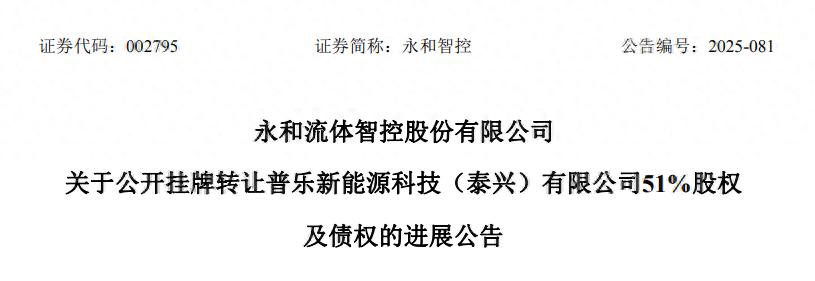 公告显示,2025年11月4日,永和智控首次公开挂牌转让泰兴普乐51%股权及全部债权,挂牌价格为3049万元。2025年11月20日,公司推进第二次挂牌转让,挂牌转让底价为2439.2万元。12月1日,公司进行第三次挂牌,挂牌价格在首次挂牌基础上下调40%,转让底价为1829.4万元。12月9日,公司推进第四次挂牌转让,转让底价为1219.6万元。