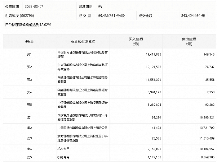 3月7日,世嘉科技今日涨停,龙虎榜数据显示,上榜营业部席位全天成交1.25亿元,占当日总成交金额比例为14.84%。其中,买入金额为6375.81万元,卖出金额为6137.91万元,合计净买入237.9万元。