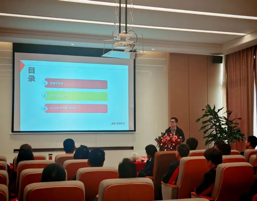 参观结束后,全体人员齐聚多功能厅,正式开启年度工作汇报环节。 世嘉科技 创始人,总经理韩惠明先生、 世嘉科技 董事长王娟女士先后登台致辞,各分公司代表逐一亮相。大家围绕 2025 年度销售业绩、市场拓展、客户服务、团队建设等核心板块全面复盘,分享实战案例与成功经验,客观剖析市场形势与现存挑战,同时明确 2026 年度工作计划与发展目标。