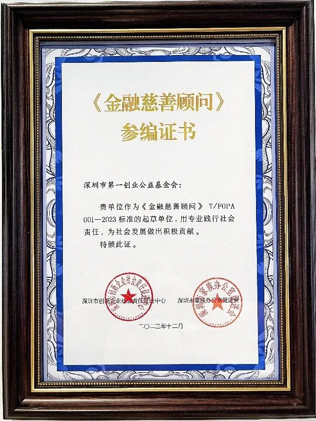 活动还举行了《金融慈善顾问》团体标准预发布仪式,表彰为该团体标准作出贡献的单位及个人。深圳市第一创业公益基金会作为《金融慈善顾问》T/FOPA001-2023 标准的起草单位之一,获颁“《金融慈善顾问》参编证书”,基金会副秘书长兰瑾作为《金融慈善顾问》团体标准参编起草人之一,获颁“《金融慈善顾问》参编证书”。