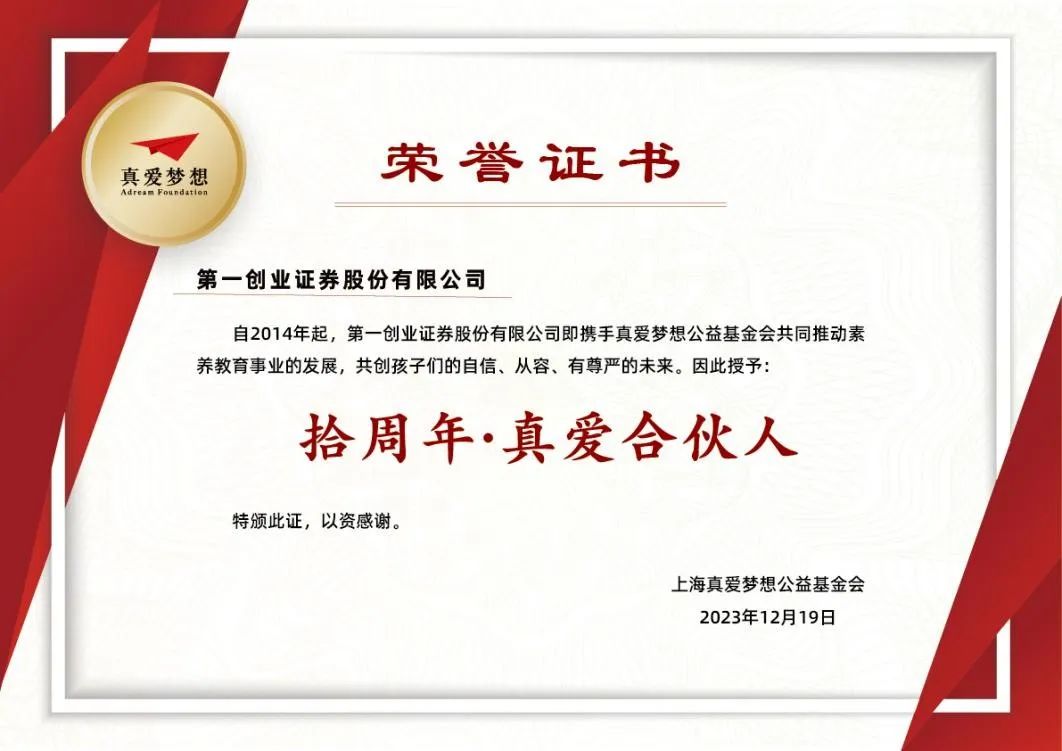图:上海真爱梦想公益基金会向第一创业颁发“拾周年·真爱合伙人”荣誉证书