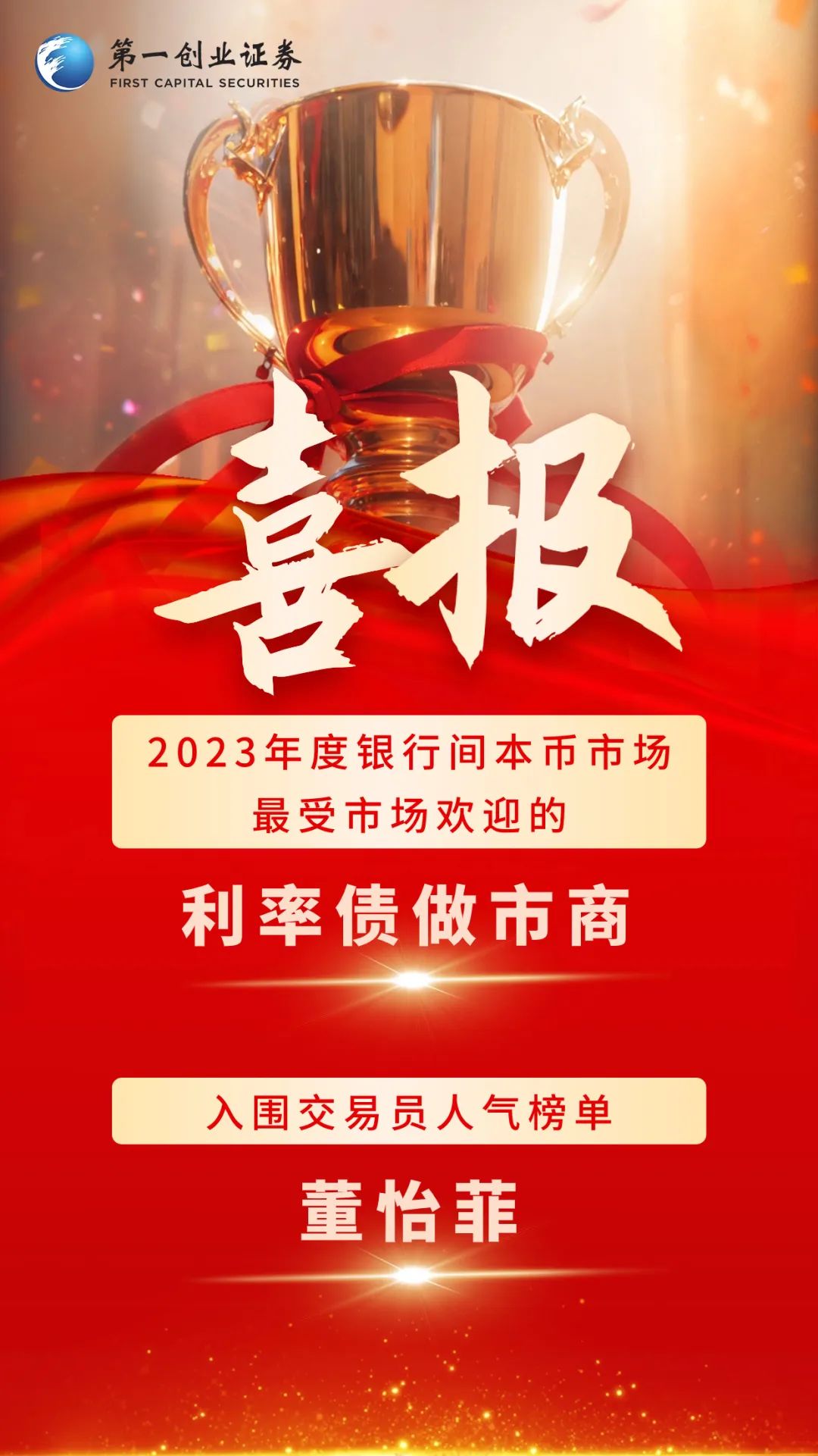 近日,全国银行间同业拆借中心公布了2023年度银行间本币市场人气榜单,第一创业证券荣获“最受市场欢迎的利率债做市商”奖项,固定收益交易投资部董怡菲入围本币市场交易员人气榜单。