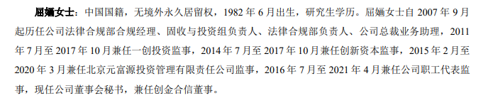 据第一创业证券2023年年报显示,屈婳,1982年6月出生,今年42岁,研究生学历。自2007年9月起历任公司法律合规部合规经理、固收与投资组负责人、法律合规部负责人、公司总裁业务助理,2011年7月至2017年10月兼任一创投资监事,2014年7月至2017年10月兼任创新资本监事,2015年2月至2020年3月兼任北京元富源投资管理有限责任公司监事,2016年7月至2021年4月兼任公司职工代表监事。