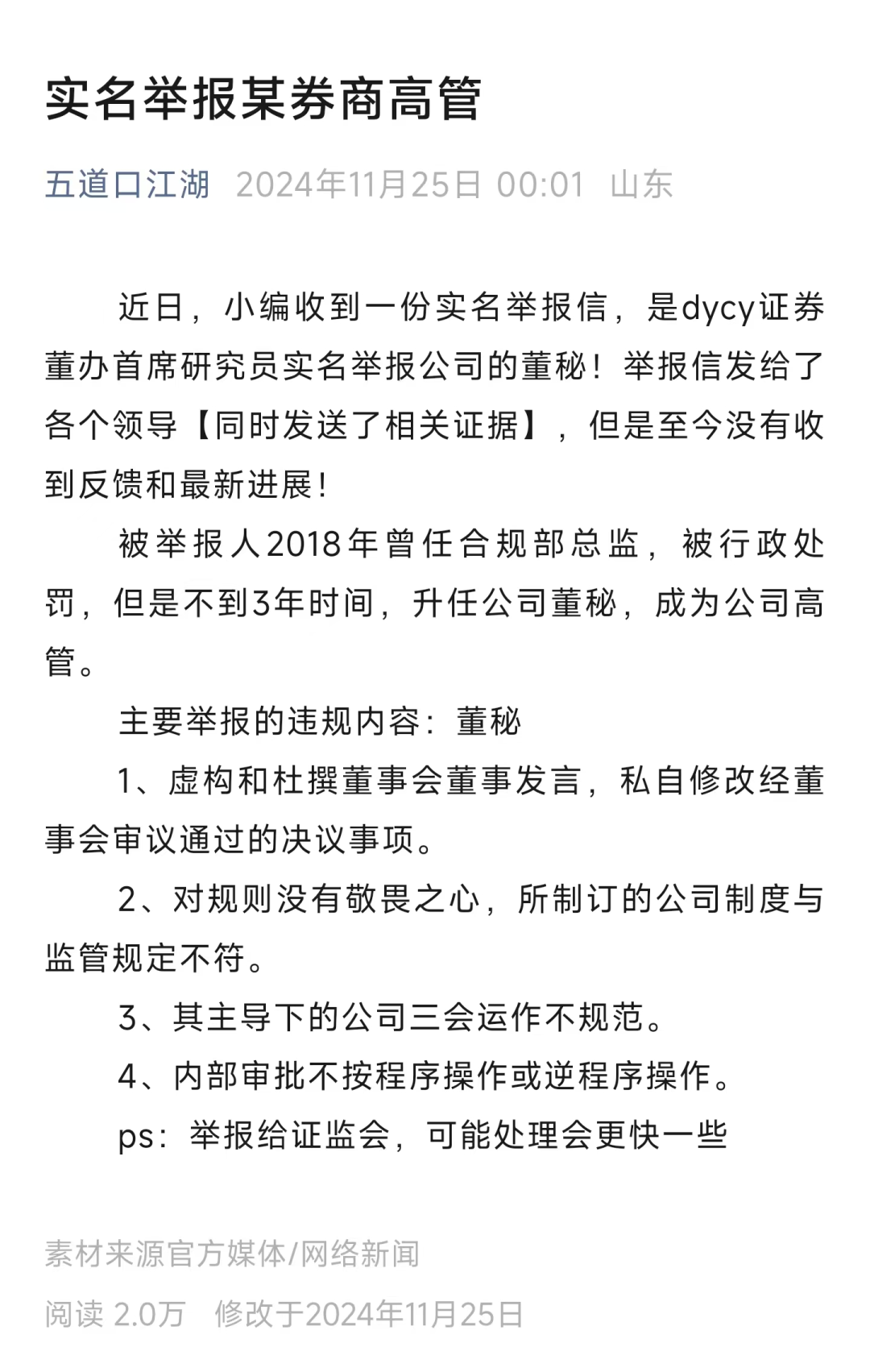 此前,微信公众号@五道口江湖发文称,收到一封来自dycy证券董办首席研究员针对公司董秘的实名举报信。信中提到,被举报董秘于2018年曾任合规部总监,被行政处罚,但是不到3年便升任公司董秘,成为公司高管。