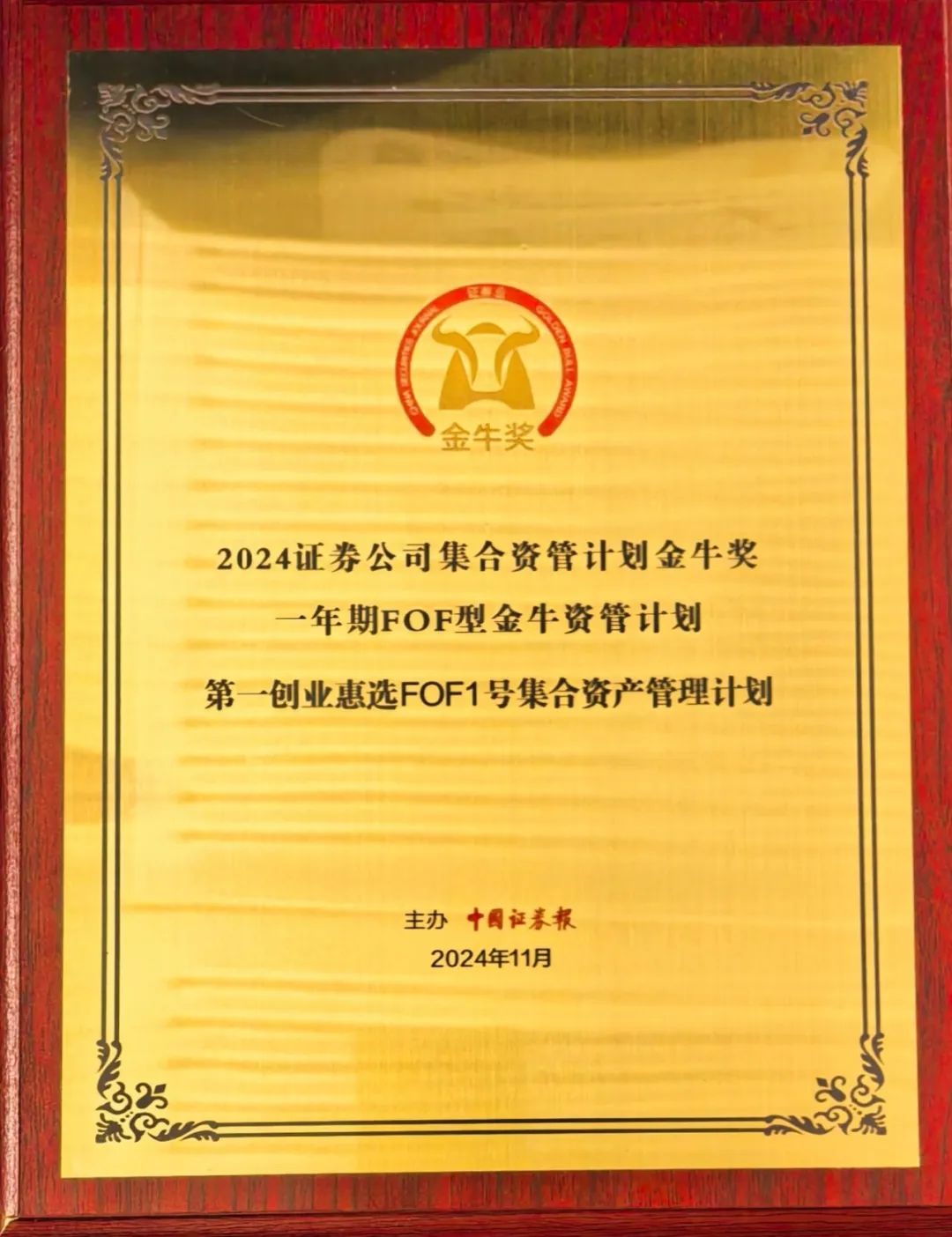 2024年11月22日,备受瞩目的“2024中国金牛奖”评选结果正式揭晓。“第一创业惠选FOF1号集合资产管理计划”凭借其卓越的市场表现和出色的风险管理能力,赢得了业界的广泛赞誉,荣获“一年期FOF型金牛资管计划”奖项。
