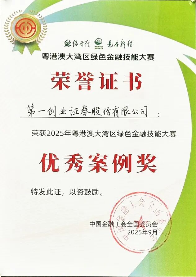 9月17日,由中国金融工会主办的粤港澳大湾区绿色金融技能大赛决赛暨粤港澳大湾区绿色金融区域协同发展交流会在广州南沙圆满落幕,粤港澳大湾区70多家银行、保险、证券等金融机构参加了本次大赛。第一创业证券凭借绿色金融体系化发展创新实践,荣获绿色金融产品与服务创新“优秀案例奖”。