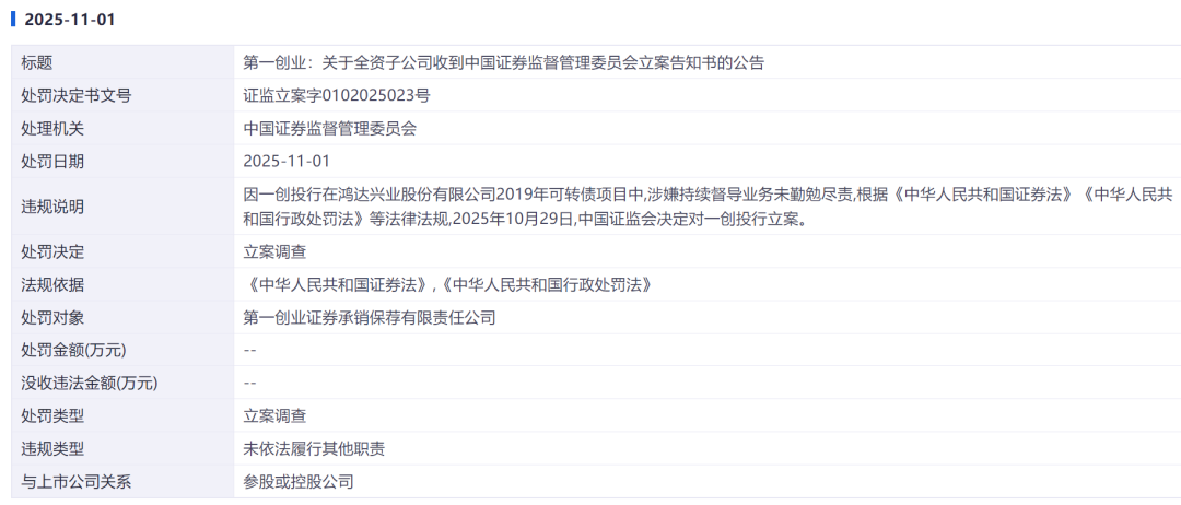 具体来看,一创投行在 鸿达兴业股份有限公司 (下称“鸿达兴业”,已退市)2019年可转债项目中,涉嫌持续督导业务未勤勉尽责,根据相关法律法规,中国证监会决定对一创投行立案。今年以来,一创投行是行业内唯一因投行业务被中国证监会立案调查的证券公司。