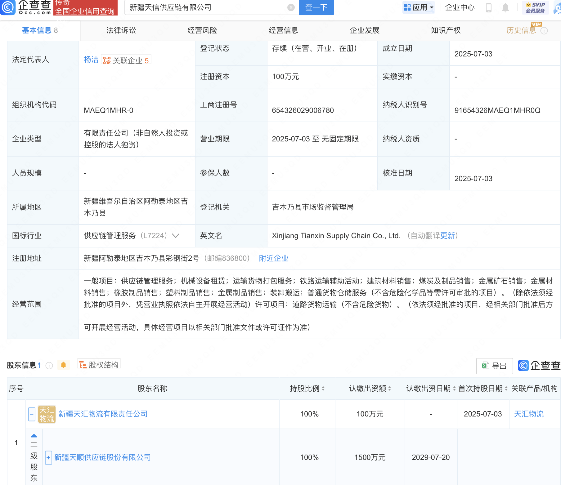 近日,新疆天信供应链有限公司成立,法定代表人为杨洁,经营范围包含:供应链管理服务;机械设备租赁;运输货物打包服务;铁路运输辅助活动等。股权穿透显示,该公司由天顺股份(002800)间接全资持股。