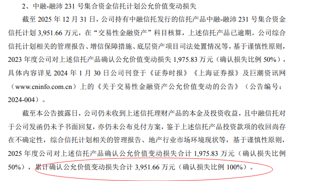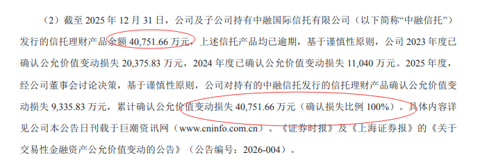 公告称,截至2025年12月31日,公司及子公司持有中融国际信托有限公司发行的信托理财产品余额40,751.66万元,上述信托产品均已逾期,基于谨慎性原则,公司2023年度已确认公允价值变动损失20,375.83万元,2024年度已确认公允价值变动损失11,040万元。2025年度,经公司董事会讨论决策,基于谨慎性原则,公司对持有的中融信托发行的信托理财产品确认公允价值变动损失9,335.83万元,累计确认公允价值变动损失40,751.66万元(确认损失比例100%)。