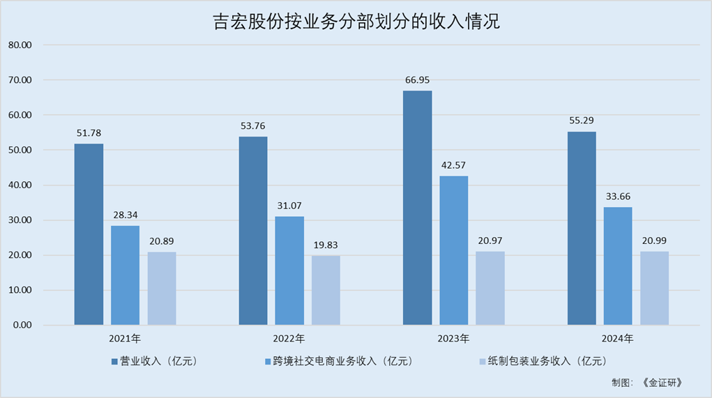据最后可行日期为2024年8月14日的招股书(以下简称“2024年8月14日招股书”)及最后可行日期为2025年4月6日的招股书(以下简称“2025年4月6日招股书”),2021-2024年,吉宏股份跨境社交电商业务的收入分别为28.34亿元、31.07亿元、42.57亿元、33.66亿元,分别占总营收比重的54.7%、57.8%、63.6%、60.9%;纸制包装业务的收入分别为20.89亿元、19.83亿元、20.97亿元、20.99亿元,分别占营业收入的40.3%、36.9%、31.3%、38%。